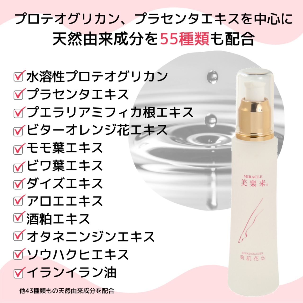 プロテオグリカンやプラセンタエキス、ダイズエキス、プエラリアミリフィカ根エキスなど、55種類もの植物由来の美容成分が配合されており、肌にハリと潤いを与えます。